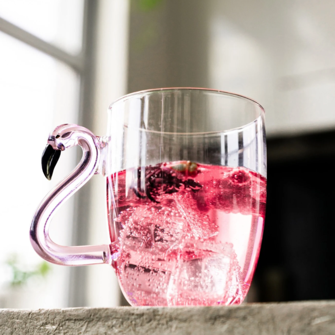 A playful borosilicate glass mug with a flamingo-shaped handle, perfect for hot and cold beverages with a stylish twist.