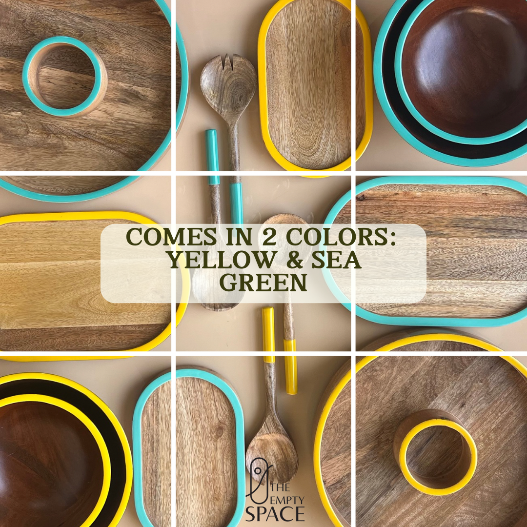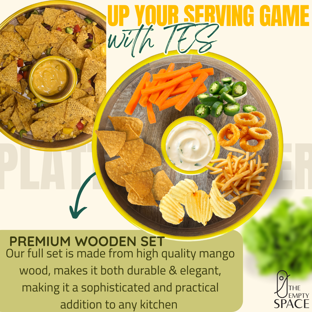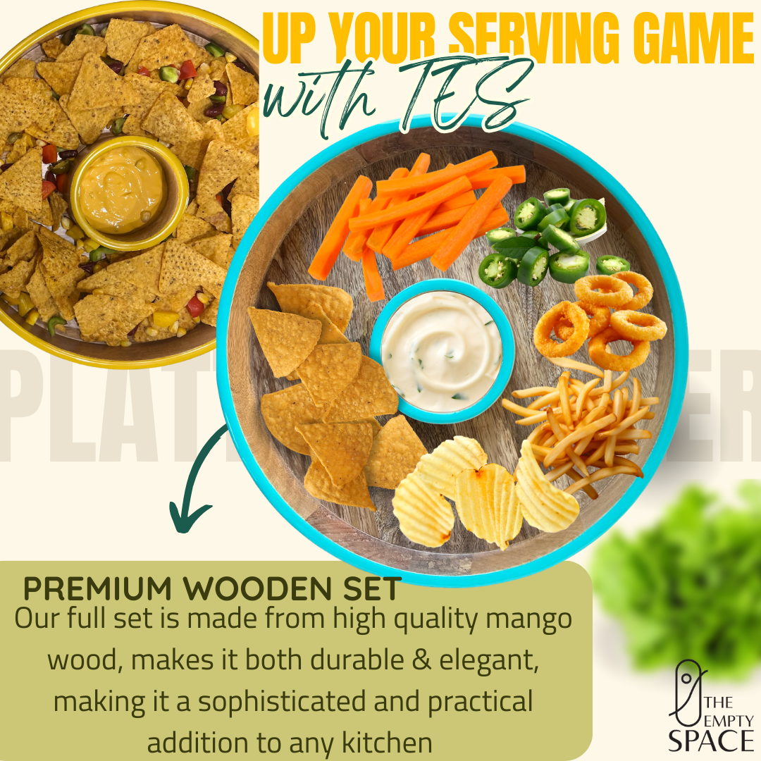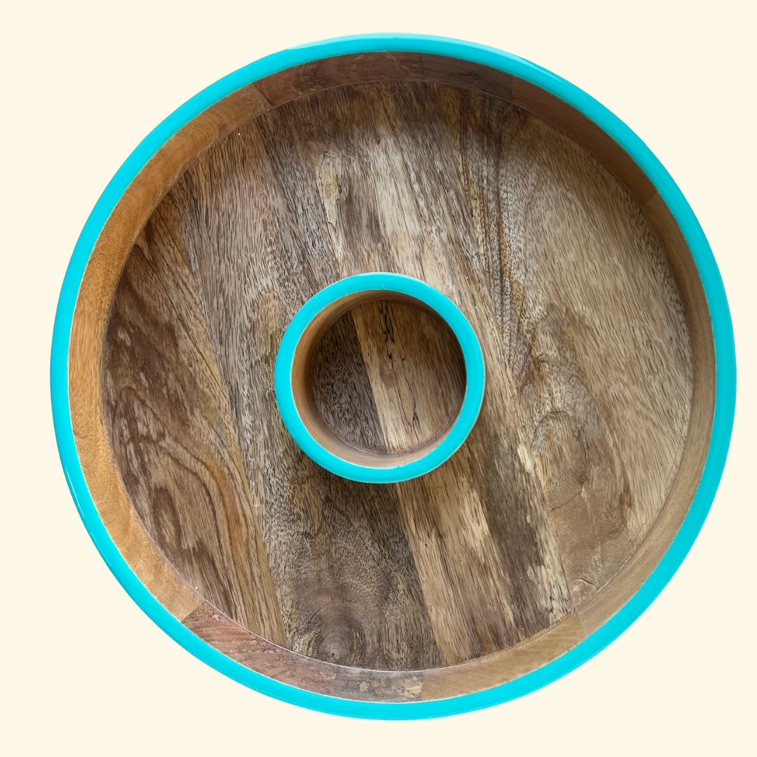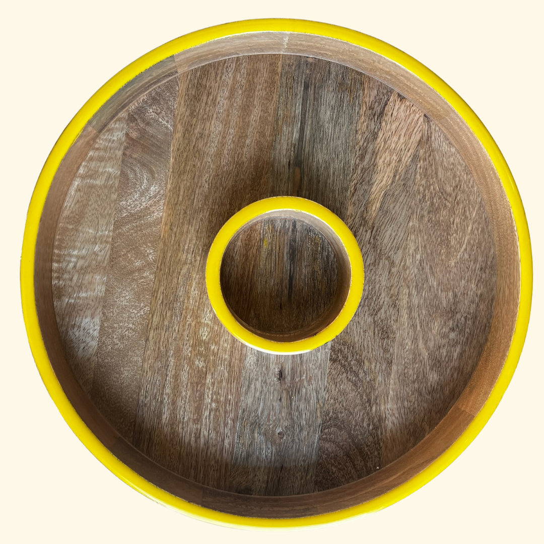 Crafted from high-quality, sustainably sourced mango wood, this 13-inch platter features a central dip bowl surrounded by a spacious outer section—perfect for chips, fries, crudités, nachos, or finger foods. The smooth wooden surface highlights the natural grain of mango wood, while the refreshing sea green or bold yellow rim adds a modern, playful pop of colour to your table.
